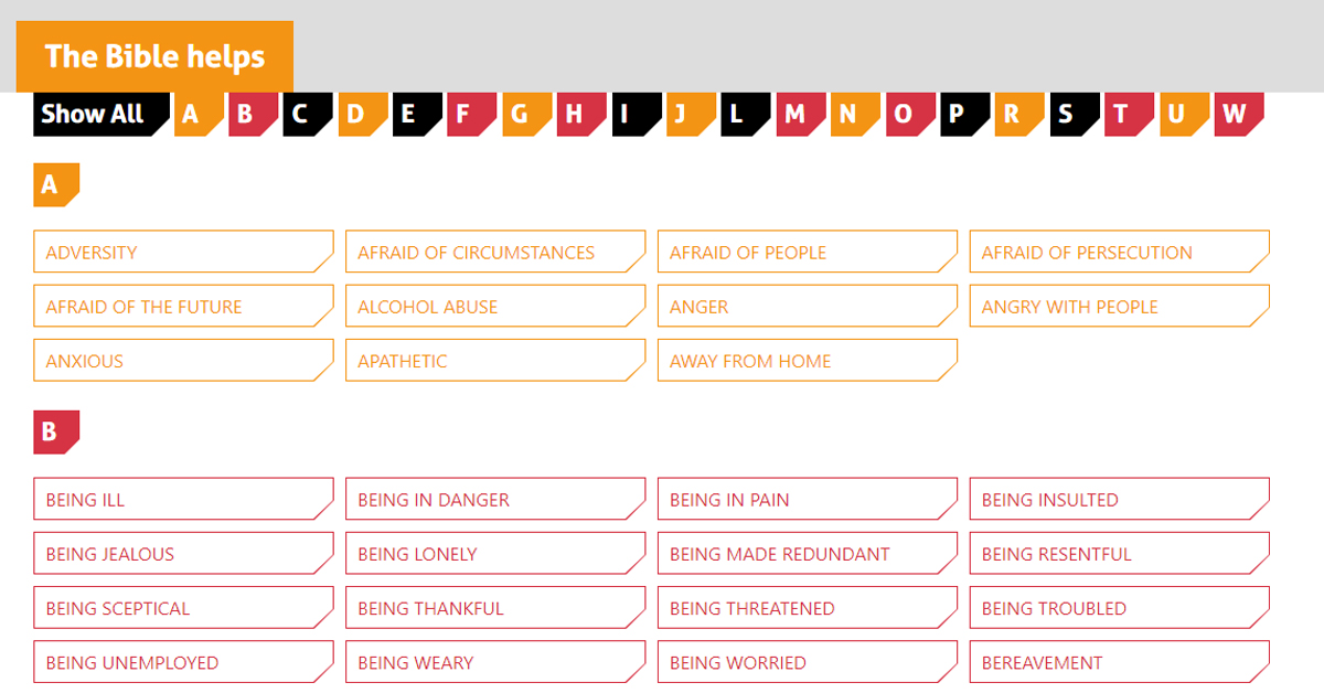 Good News for Everyone (formerly known as Gideons UK) has an index of life situations, with links to suggested Bible verses which can help at such times. For example: