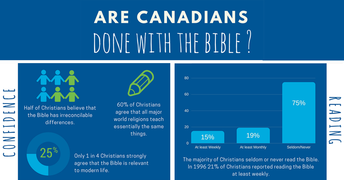 The Canadian Bible Engagement Study, published on 1 May 2014, found that “about one in seven Canadians, or 14%, read the Bible at least once a week. The majority of Canadians, including those who identify themselves as Christians, read the Bible either seldom or never”.