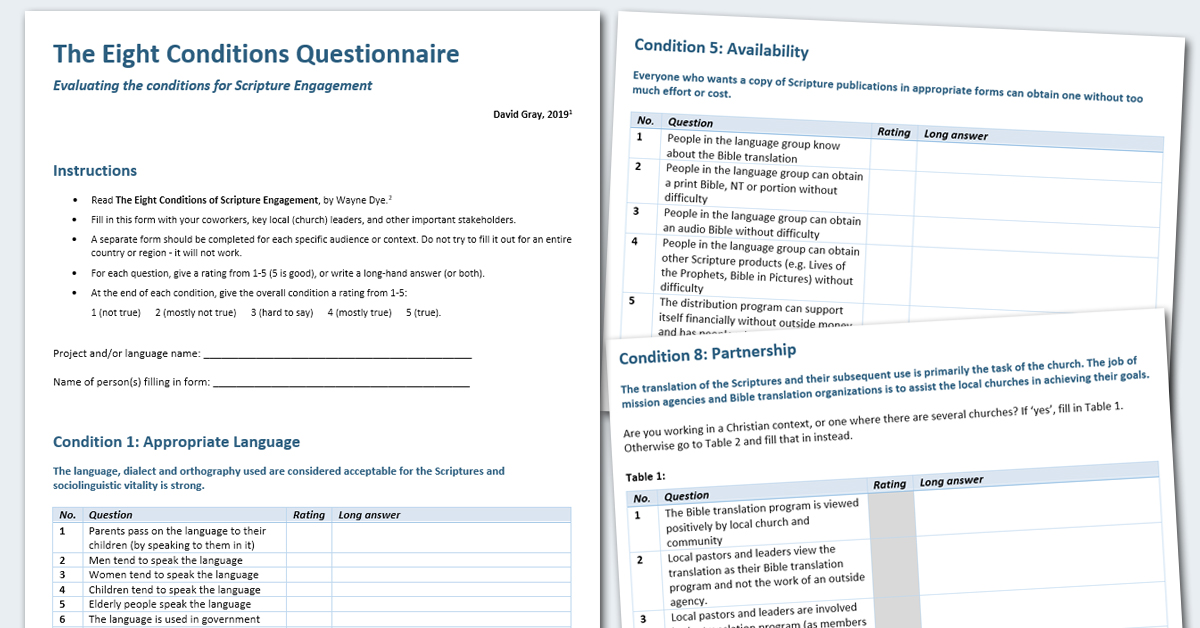 This questionnaire takes you through each of Wayne Dye’s Eight Conditions of Scripture Engagement, asking questions to help you evaluate a particular context.