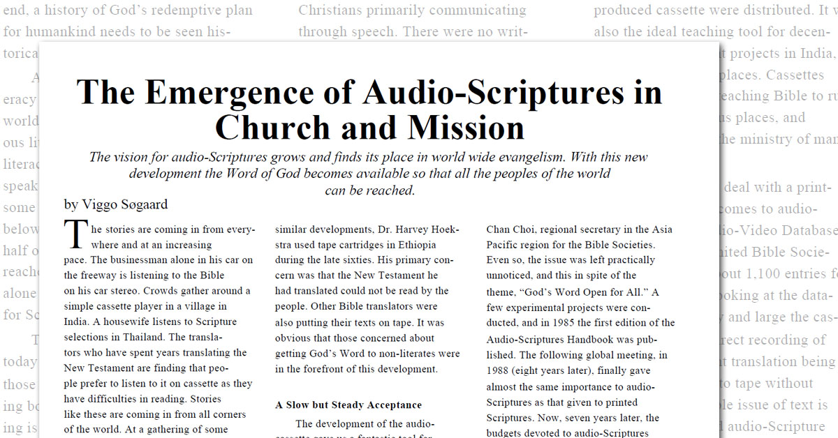 Viggo Søgaard describes how audio Scriptures saw a slow but steady acceptance from the 1970s onwards, as people saw the need for something more than printed Bibles. He charts the work of early pioneers like Dr. Harvey Hoekstra and of ministries to provide audio Scriptures for the blind.