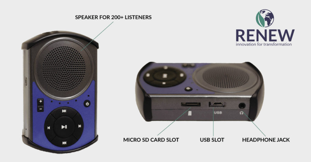 It is a solar powered audio player with 8GB of internal memory, three levels of content navigation, a rechargeable Li-ion battery and a built-in solar panel. It is compact, water-resistant and lightweight.