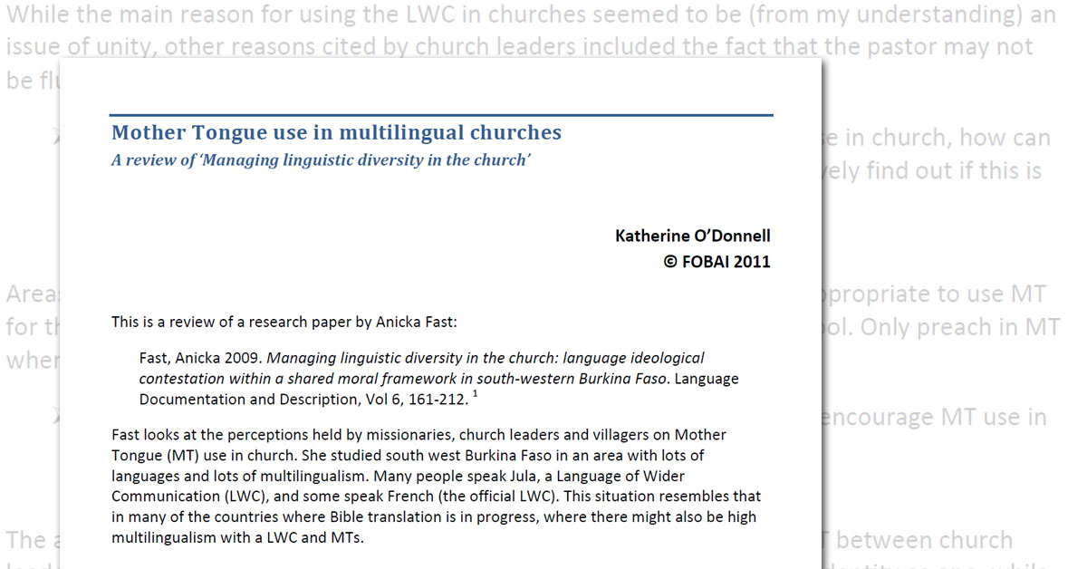 In this review, Katherine O’Donnell reflects on Fast’s research as she looks at the perceptions held by missionaries, church leaders and villagers on Mother Tongue (MT) use in church. Fast studied south west Burkina Faso in an area with lots of languages and lots of multilingualism. Many people speak Jula, a Language of Wider Communication (LWC), and some speak French (the official LWC). This situation resembles that in many of the countries where Bible translation is in progress, where there might also be high multilingualism with a LWC and MTs.