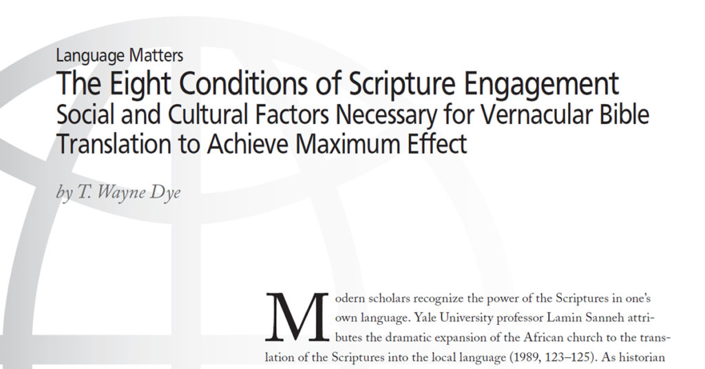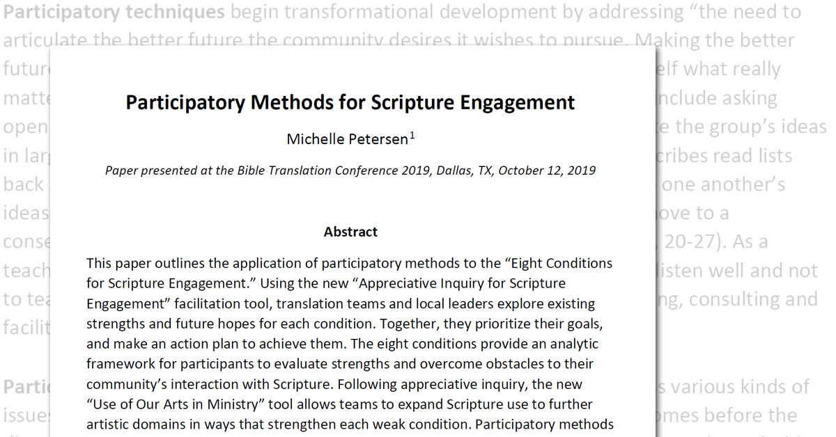 This paper outlines the application of participatory methods to the “Eight Conditions for Scripture Engagement.”