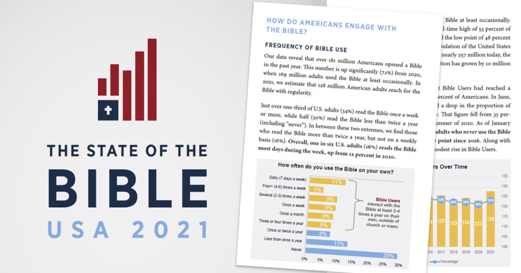 “Faith communities have demonstrated incredible resilience, innovation and empathy through the pandemic. But this survey reveals that a big opportunity still remains for Christian organizations to make an impact on Scripture engagement,” said American Bible Society president and CEO, Robert Briggs. “Despite nearly every individual in the U.S. having access to the Bible, engagement has decreased. That’s been a consistent trend over the past few years, and the trend has accelerated since January 2020 throughout the pandemic. The Church must transition from ‘survival’ mode back into ‘discipleship’ mode, and, yes, that’s going to take even more innovation.”