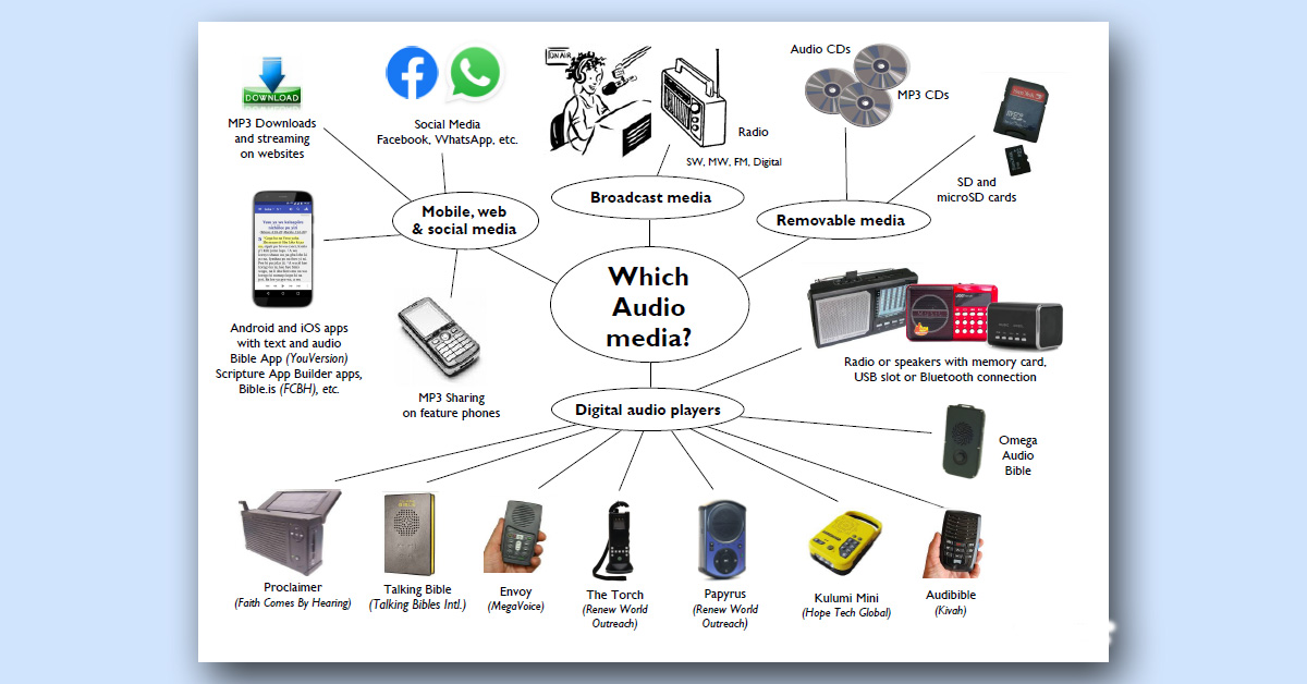 - Digital audio players (MegaVoice Envoy, Proclaimer, Talking Bible, Audibible, Papyrus, Kulumi Mini, etc. and locally available radios and speakers)